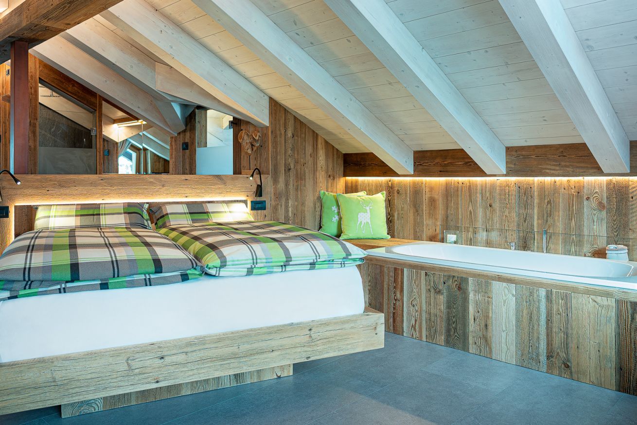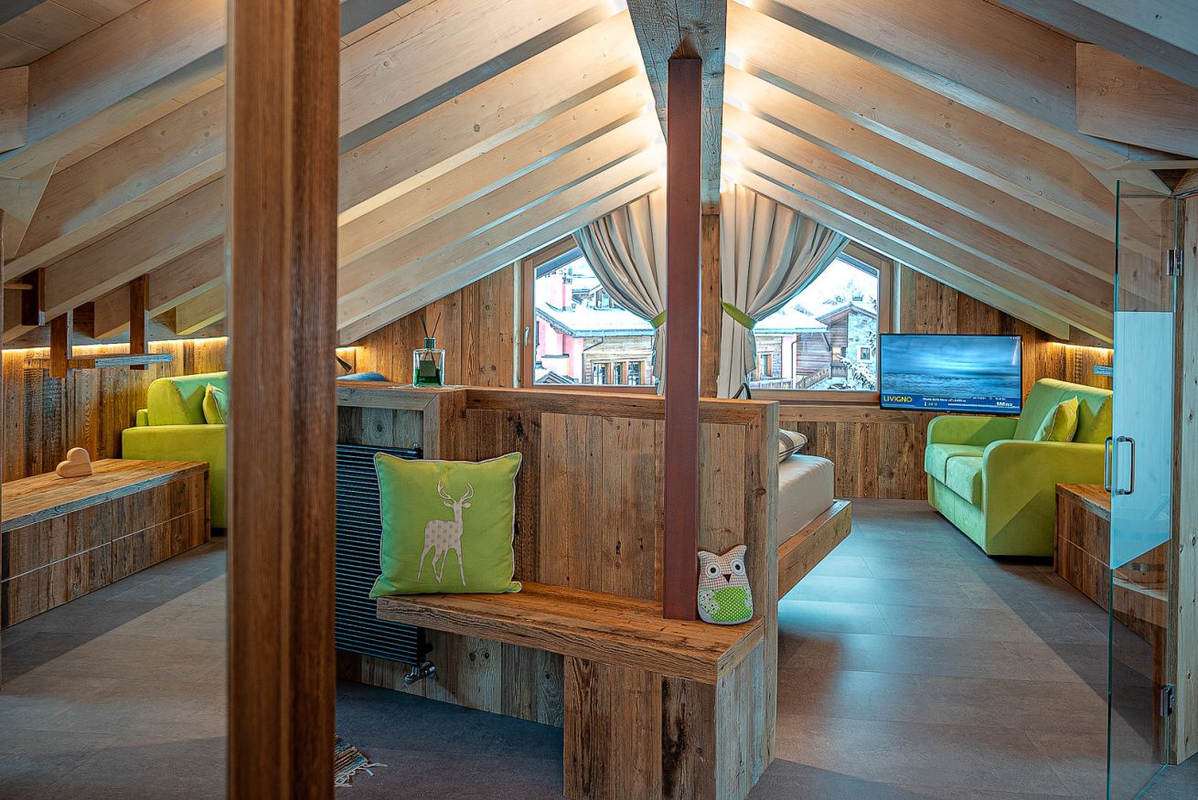 Zona notte con letto matrimoniale, vasca da bagno e chaise longue con vista sulle piste della Mottolino e i verdi prati lato est; Divano e TV 43'' LCD Sat;