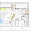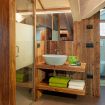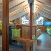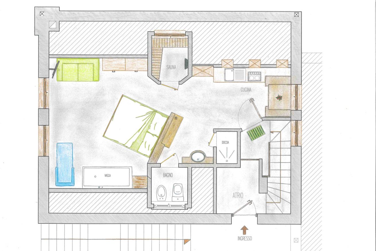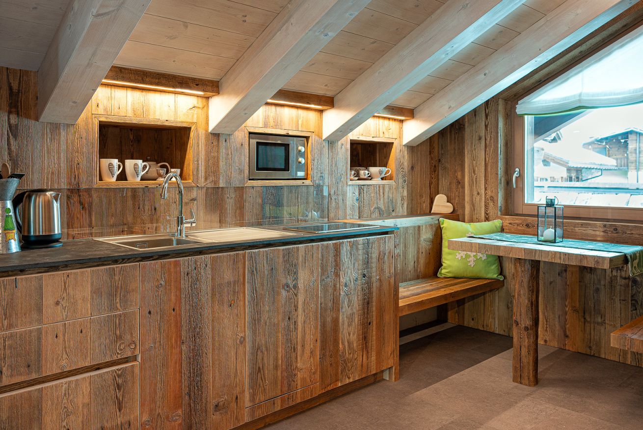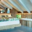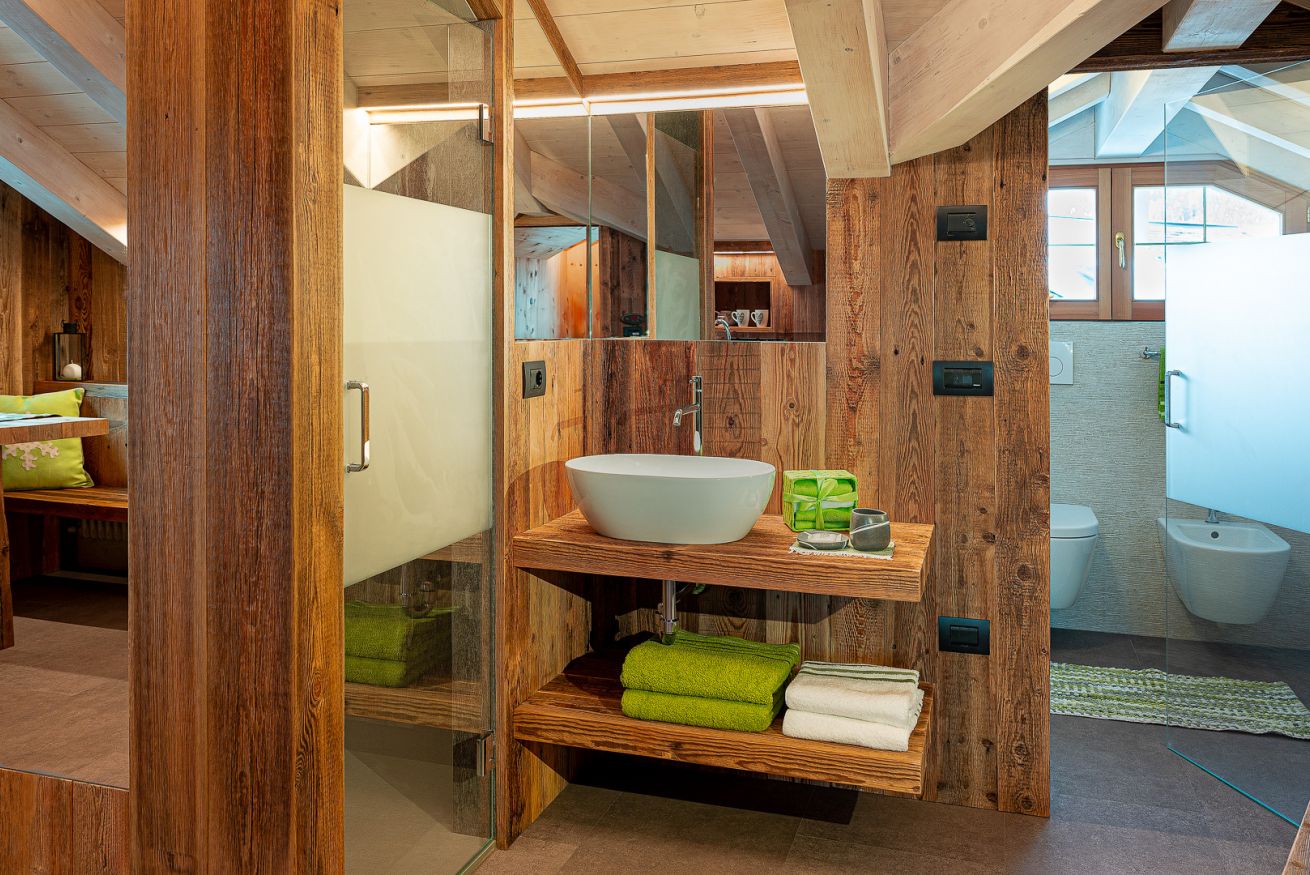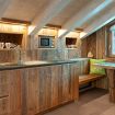 Open space arredato in pino antico dal design tipico montano, per una vacanza relax a due.